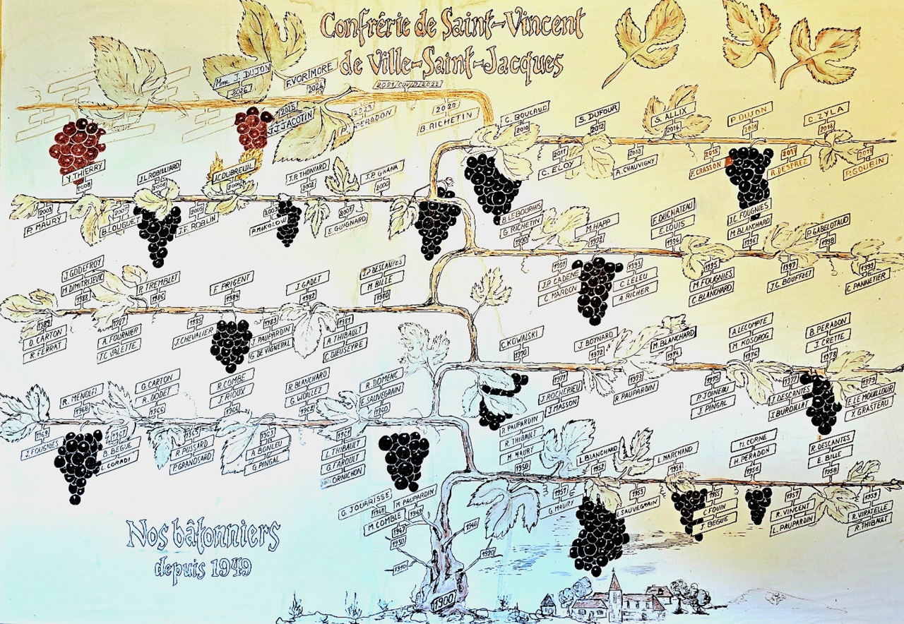 En marge de notre chant de St Vincent moyenâgeux, de nos bannières ancestrales, nous avons un arbre des Bâtonniers qui porte la traçabilité des intronisations depuis début 1900. On y remarque des générations qui se succèdent, parfois des fils, des pères, et même des grands pères d’une même famille confirmant bien l’attachement du village à sa tradition. En même temps, une particularité y apparait, car on y voit … que des hommes !